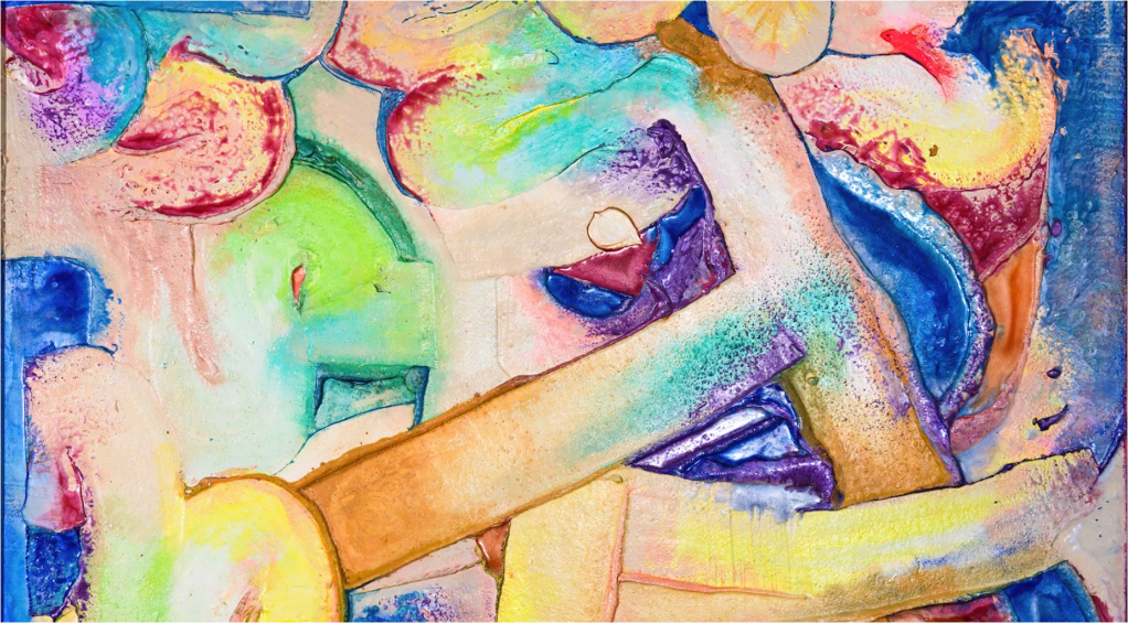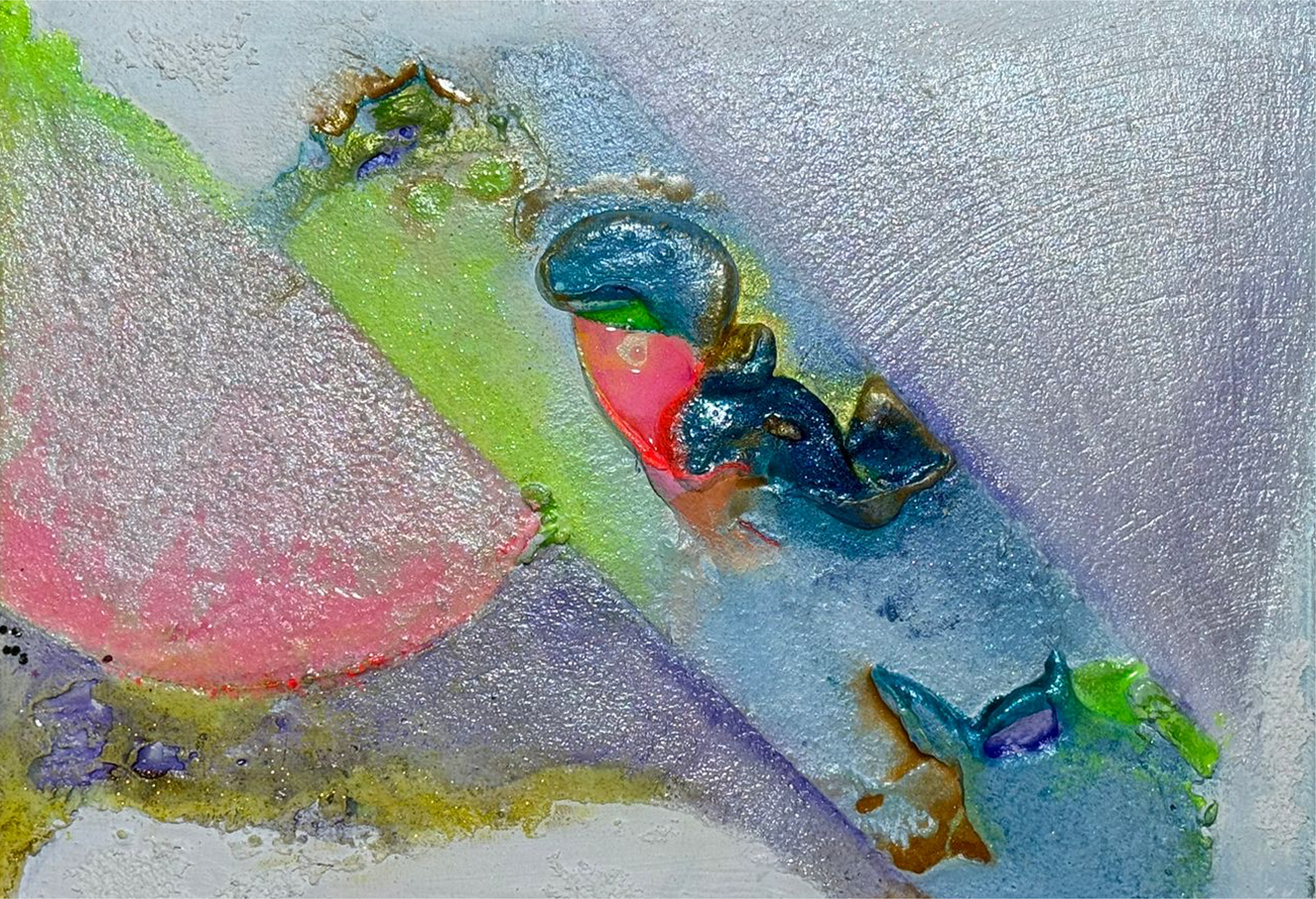 Questo quadro astratto suggerisce che nulla si disperde completamente; l’impulso creativo lascia dietro di sé frammenti intensi e inaspettati.