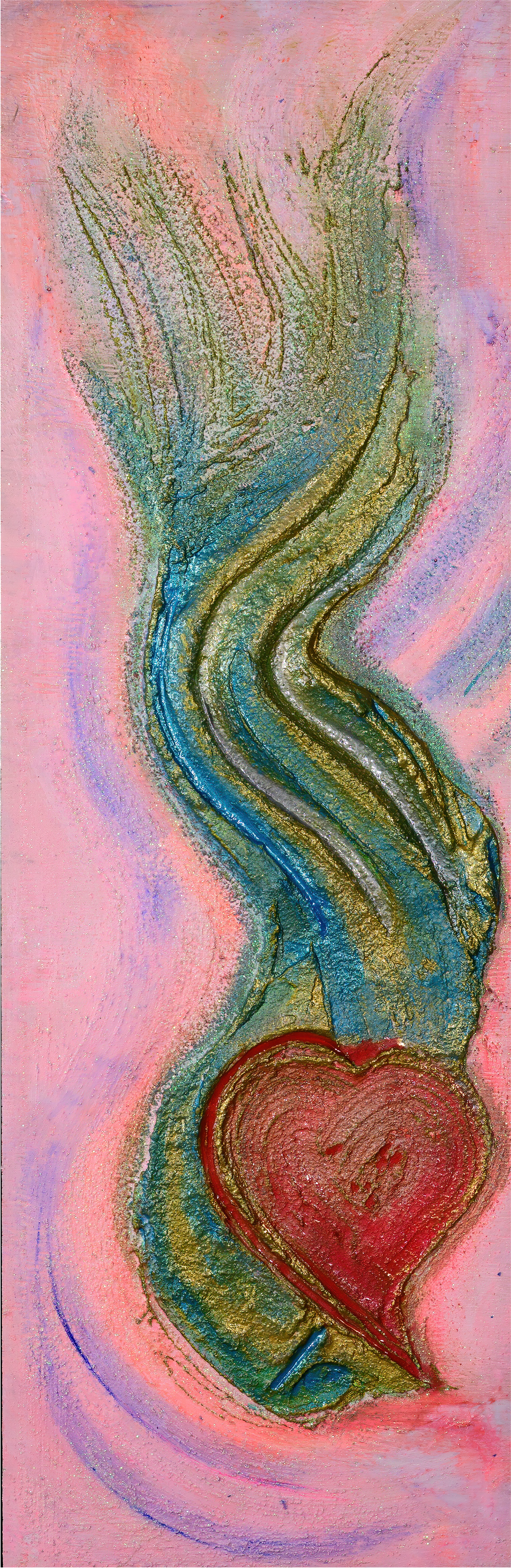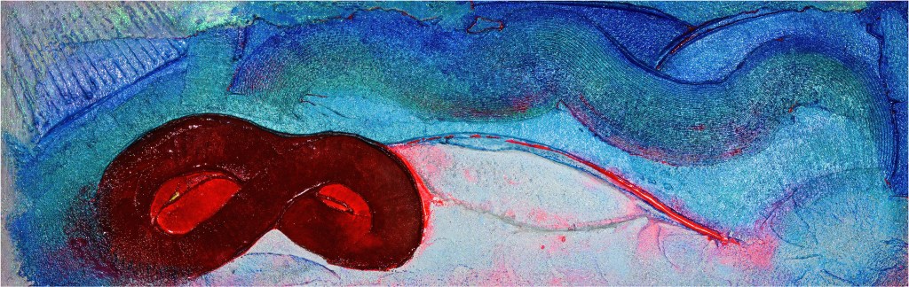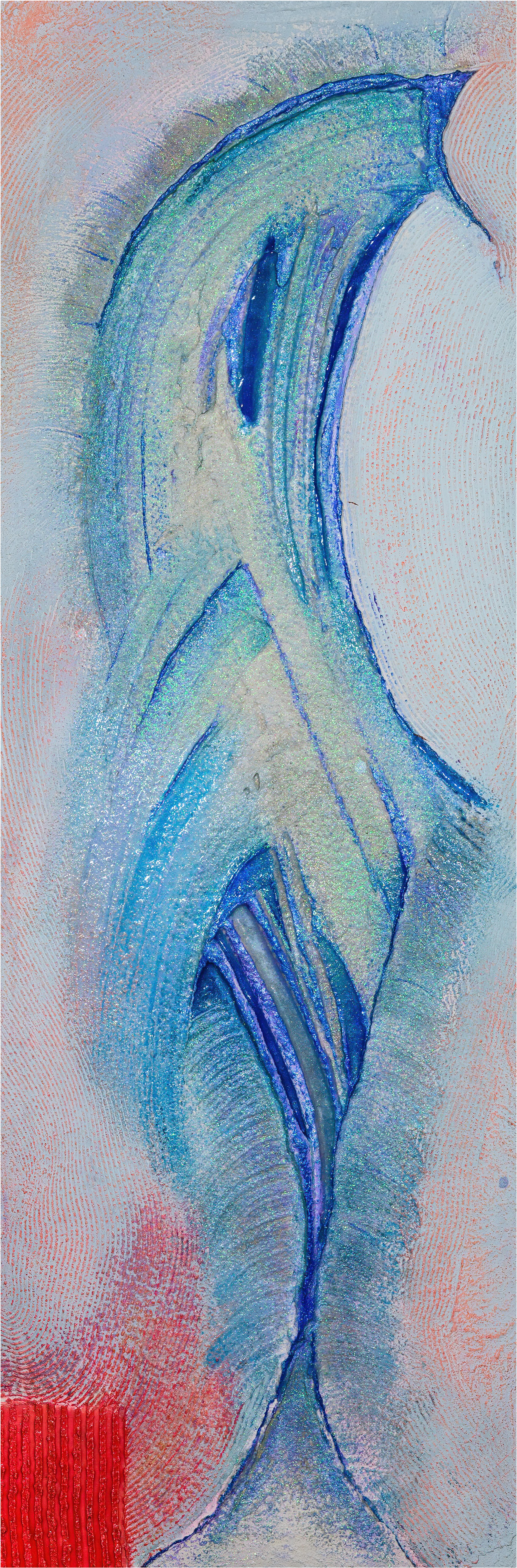 Così è nato questo primo quadro. Una “carta rossa” vibrante, quasi un cuore pulsante lasciato alle spalle, da cui germina inattesa una libertà alata. Un’ala che respira nuova aria, che nel suo slancio ricorda la fluidità di un delfino che si immerge in un oceano di possibilità. Questo non è un addio malinconico, ma un “muovi le ali, sei libera” sussurrato a me stessa.
