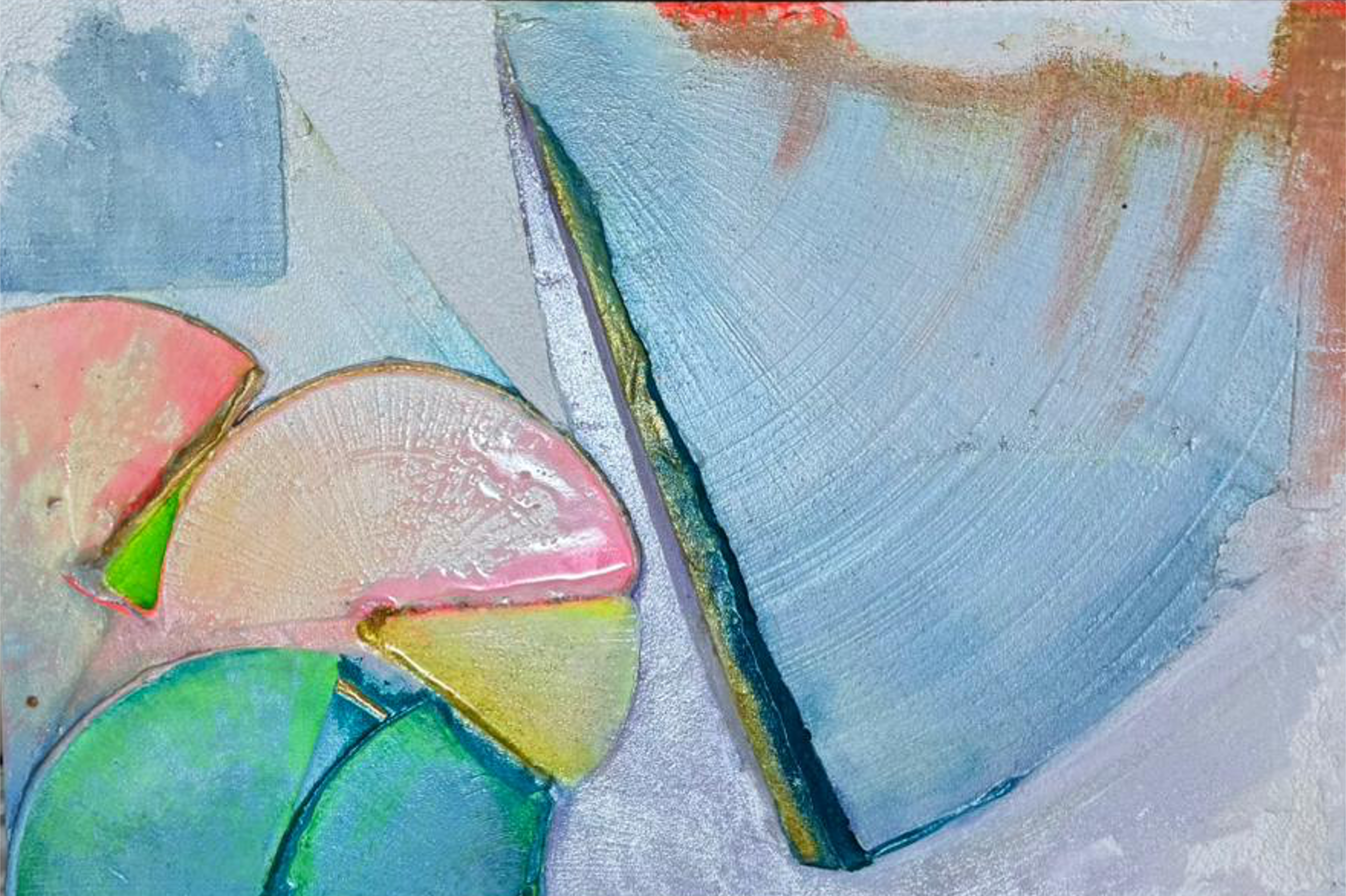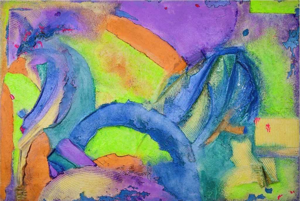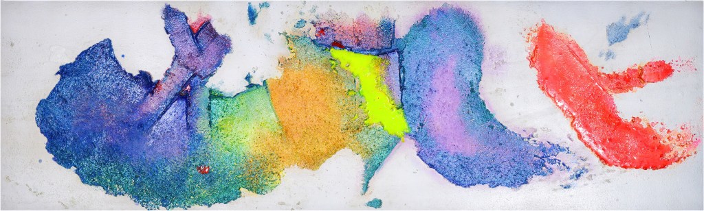 “Avanzi” è un’esplosione di colori che cattura l’energia vibrante rimasta dalla creazione di un’altra opera, quasi una scia luminosa proveniente da un altro spazio.