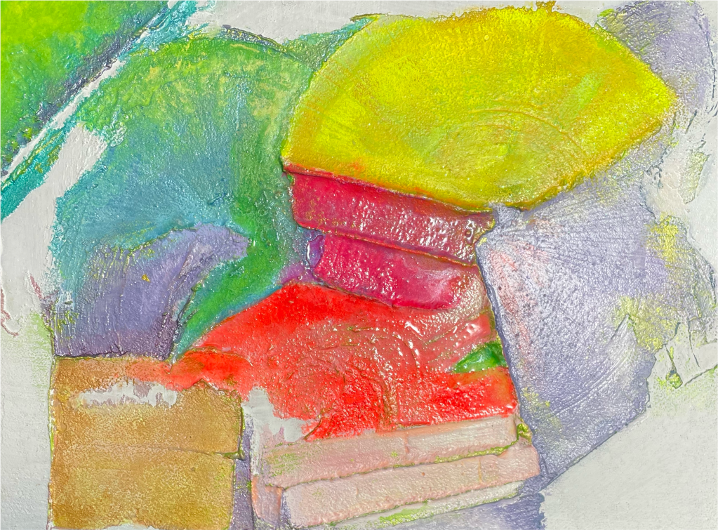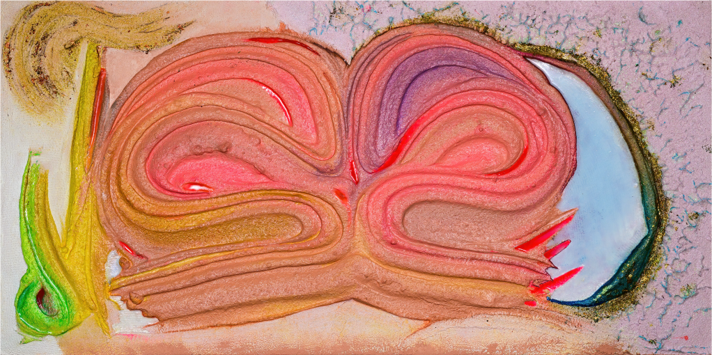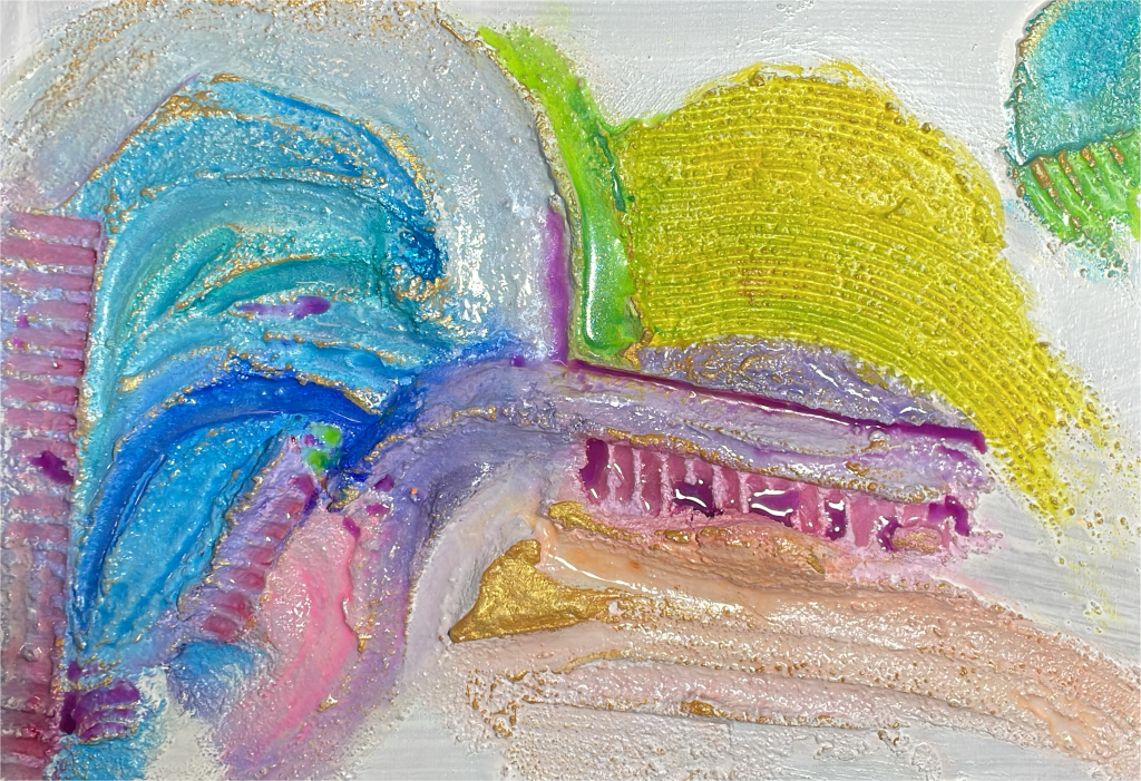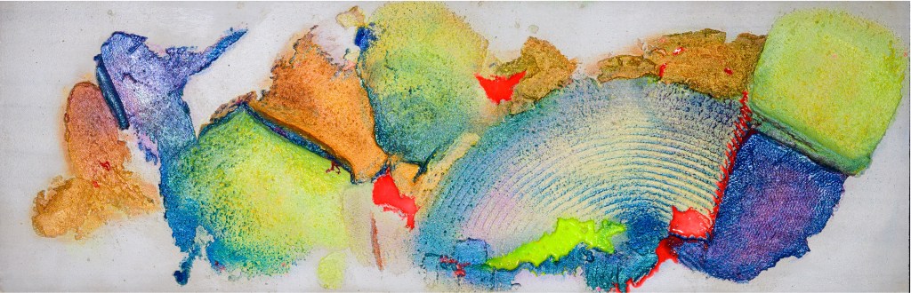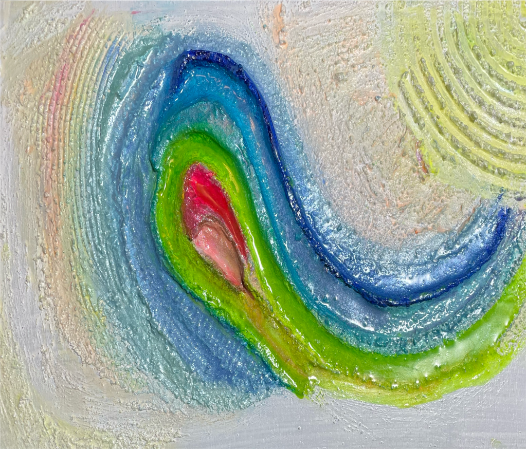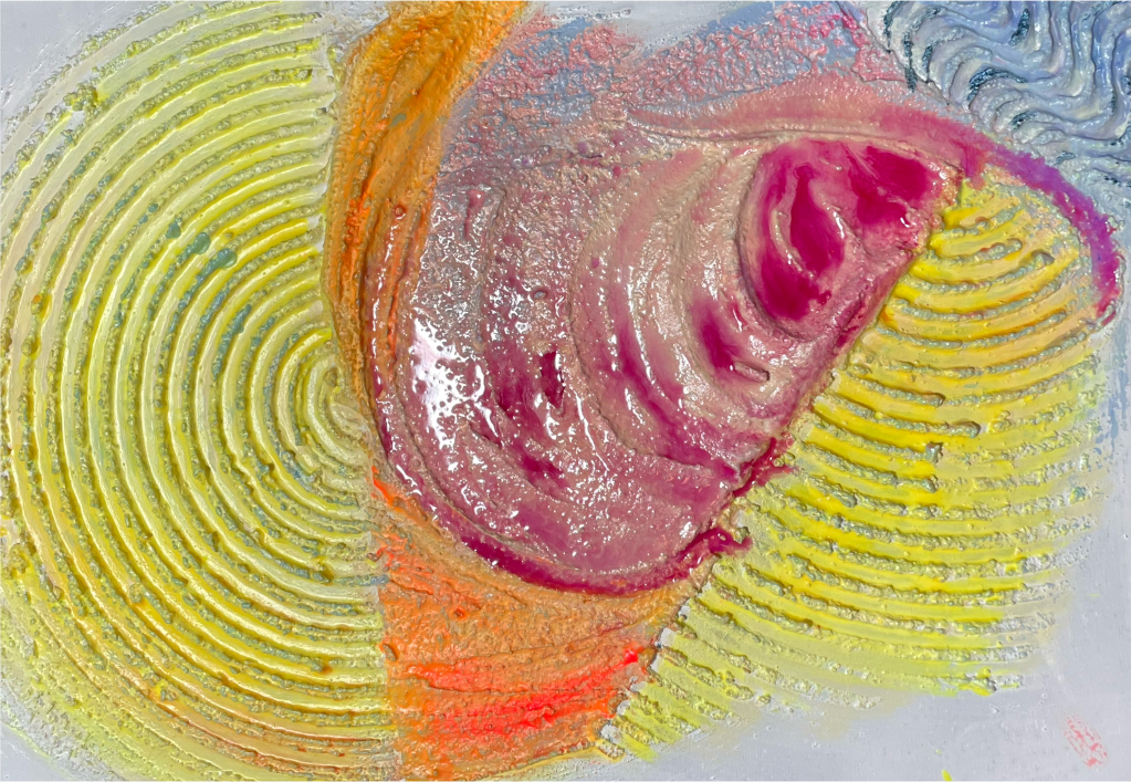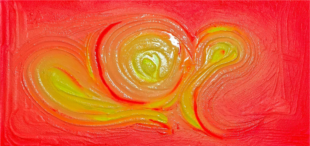 I colori si mescolano e si sovrappongono con forza, creando un movimento che ricorda l’eco di un evento, forse perfino il riverbero di un’altra realtà. Ogni pennellata è una traccia di questa energia persistente, invitando chi guarda a percepire la vitalità che si manifesta anche in ciò che sembra un “avanzo”, come un ponte colorato verso altre possibilità.